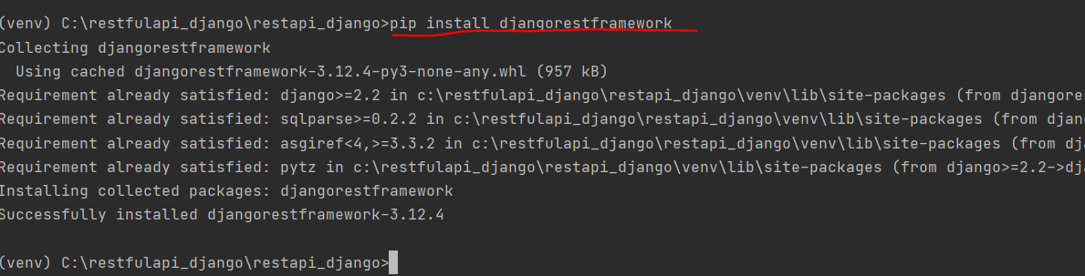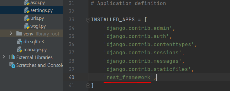 설치를 하고 난 후 INSTALLED_APPS 에 'rest_framework' 를 추가하고 urlpatterns 에 api 경로를 추가 해주라는 설명이 나와 있다 그대로 진행해 준다.