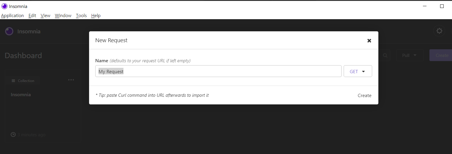 먼저 insomnia를 실행한 후 처음에 나오는 부분은 스킵 한다. 그후 ctrl + n 을 하면 새로운 Request를 만들 수 있다.