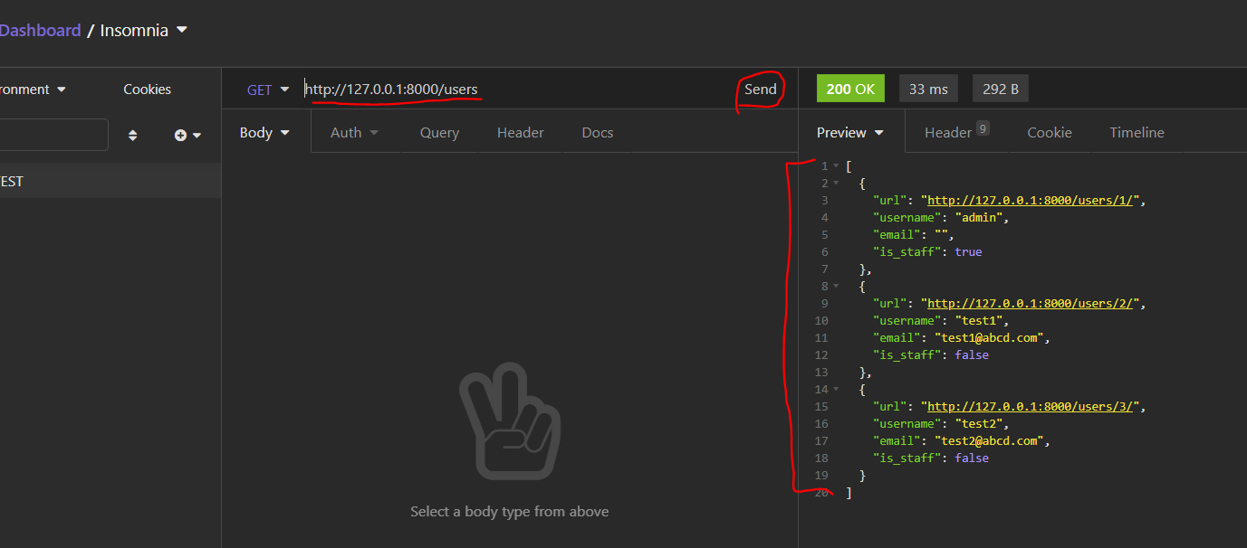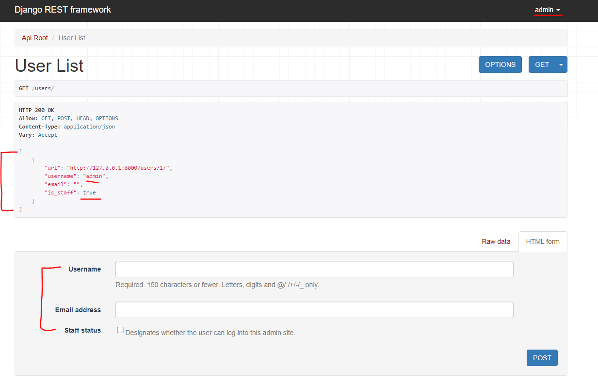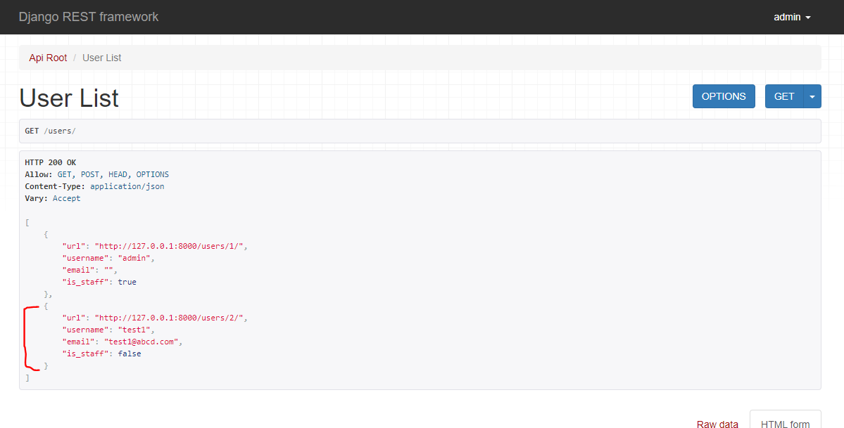 Api Root 안에 User List가 존재하고 GET 요청으로 /users/ 경로를 요청했다는 뜻이며 해당 경로 안에서 할 수 있는 것들은 GET, POST, HEAD, OPTIONS 들이 존재한다는 뜻이다. 현재 샘플 소스로 users경로에 접근을 한 것
