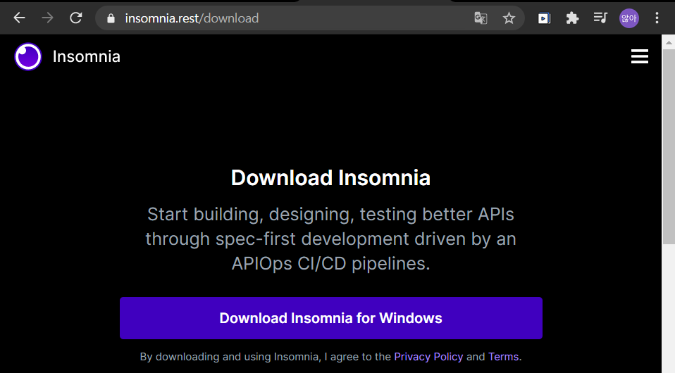 먼저 "insomnia" 홈페이지에서 다운로드 받는다. "insomnia" 툴을 사용하면 간단하게 API 호출 메세지를 만들어서 특정 서버에 호출할 수 가 있다. 즉, 테스트 툴 이라고 생각하면 된다.