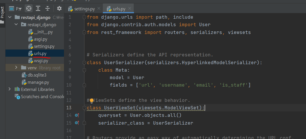 INSTALLED_APPS에 'rest_framework'를 추가해 준다음 url을 추가해 줘야하는데 urls.py는 같은 메인 app 안에 들어 있다.