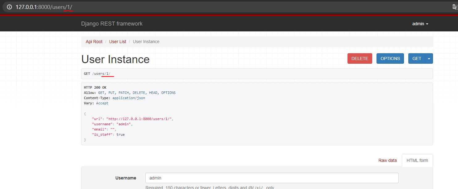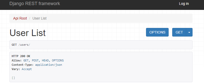 Api Root 안에 User List가 존재하고 GET 요청으로 /users/ 경로를 요청했다는 뜻이며 해당 경로 안에서 할 수 있는 것들은 GET, POST, HEAD, OPTIONS 들이 존재한다는 뜻이다. 현재 샘플 소스로 users경로에 접근을 한 것