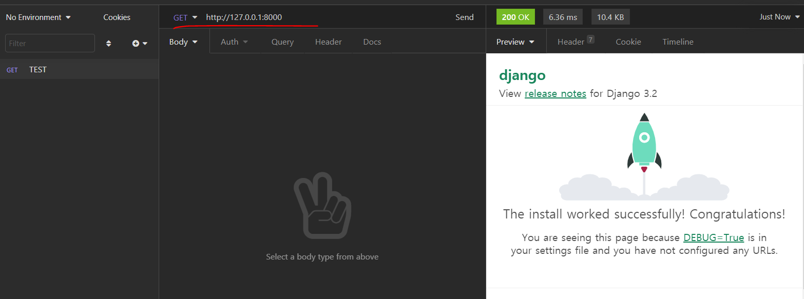 새로운 Request를 만들고 나면 위와 같은 화면을 볼 수 있는데 요청을 보낼 URL을 적어서 Send를 누르면 해당 서버에 요청이 잘 가고 응답이 오는 것을 볼 수 있다. (현재는 로컬이기 때문에 로컬 IP주소를 입력)