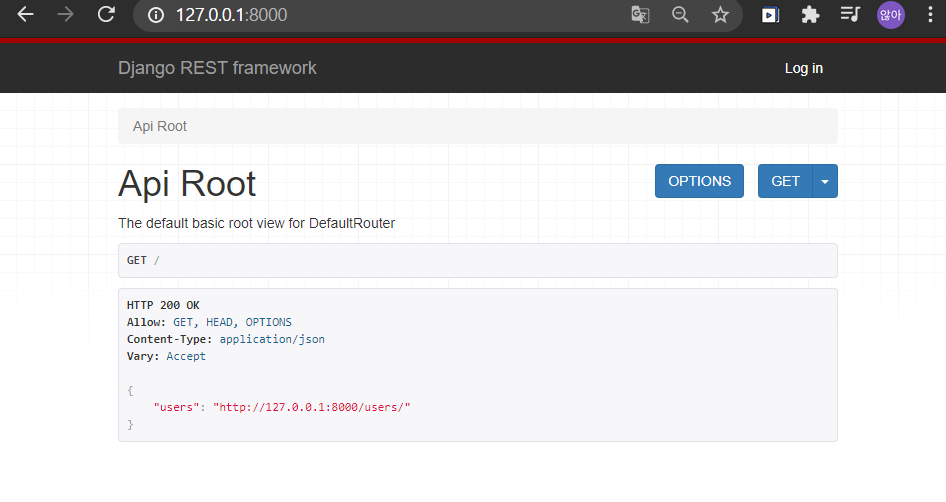 - 직접 "http://127.0.0.1:8000/users/" 를 웹 브라우저에 타이핑 해서 들어가도 되고 해당 주소를 클릭해서 들어가도 된다.