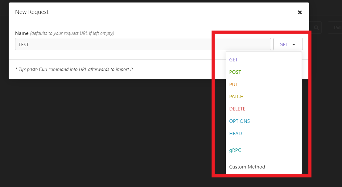 이름 부분은 원하는 이름으로 지정하면 되고 옆에 GET 부분을 클릭하면 어떤 방식으로 요청을 보낼지 선택할 수 있는 설정 창이 나온다 일단은 GET 요청으로 생성 한다.