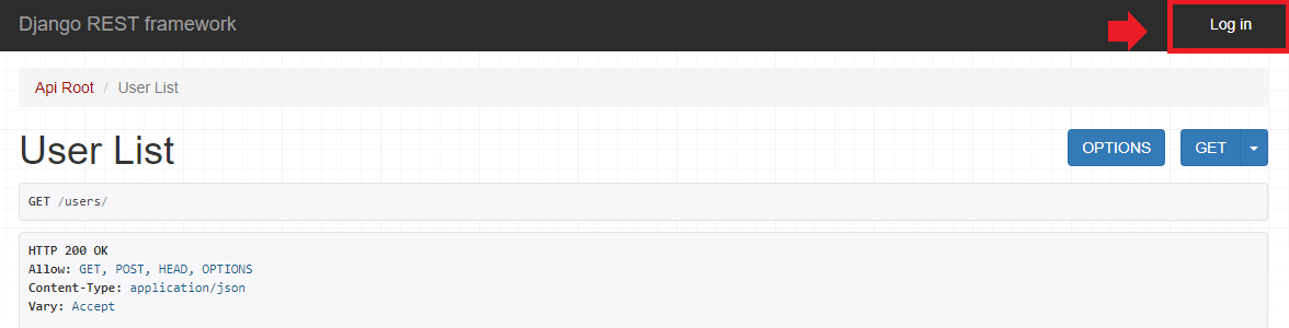 browsable API의 화면을 보면 Login을 할 수 있는데 해당 화면에서 로그인을 하기 위해서는 django 서버에서 superuser(슈퍼유저)를 생성하면 된다.