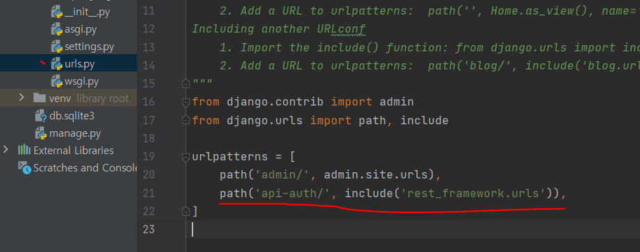 설치를 하고 난 후 INSTALLED_APPS 에 'rest_framework' 를 추가하고 urlpatterns 에 api 경로를 추가 해주라는 설명이 나와 있다 그대로 진행해 준다.