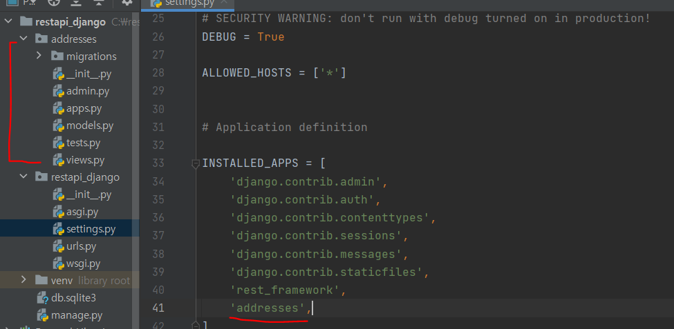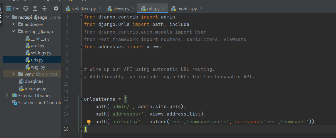 간단하게 구현하기 위해 addresses에 따로 urls.py 파일을 만들지 않고 메인 폴더(restapi_django)안에 생성되어 있는 urls.py에서 기존의 튜토리얼 코드를 삭제하고 현재 만들고 있는 addresses app에 맞춰서 url을 설정해 준다.