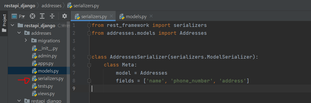 시리얼라이저(serializer)는 Django에서 기본적으로 생성되는 .py 파일이 아니다. 따라서 serializers.py 파일을 새로 생성한 다음 models.py에서 만든 Addresses 모델을 가져 온다. 그 다음 Serializer를 만드는데, class Meta에 사용할 모델이랑 사용할 필드를 적으면 끝이다. 이제 이 Serializer는 객체 데이터를 넣으면 name, phone_number, address 필드만 JSON으로 바꿔서 출력해주는 역할을 하게 된다.