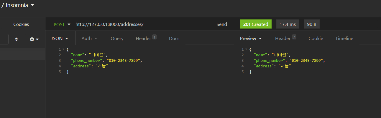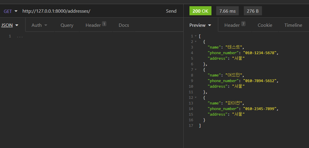 데이터를 여러개 생성한 후 다시 GET요청으로 변경한 뒤 "http://127.0.0.1:8000/addresses/"를 입력하고 요청하면 주소록(데이터) 전체가 조회 되어 응답이 돌아오는 것을 확인할 수 있다.