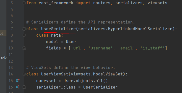 - 이 User라는 Model 안에 id, pw, email, url, is_staff 등등의 컬럼들이 존재하는데 그 여러가지 컬럼들 중에서 url, username, email, is_staff 컬럼들 만 JSON 형태로 만들기 위해 지정한 것이다. 즉, 원래는 컬럼이 더 많지만 4개의 컬럼만 Serializer로 사용하겠다 미리 정의를 해둔 것