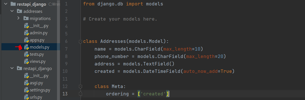 모델 소스는 간단하게 이름, 핸드폰 번호, 주소, 생성 날짜 필드를 만든다. 각 필드는 models.XXXX를 이용해 데이터 타입을 정의한다. pk를 지정하지 않으면 id라는 필드가 자동으로 생기며 pk역할을 하게 된다.
