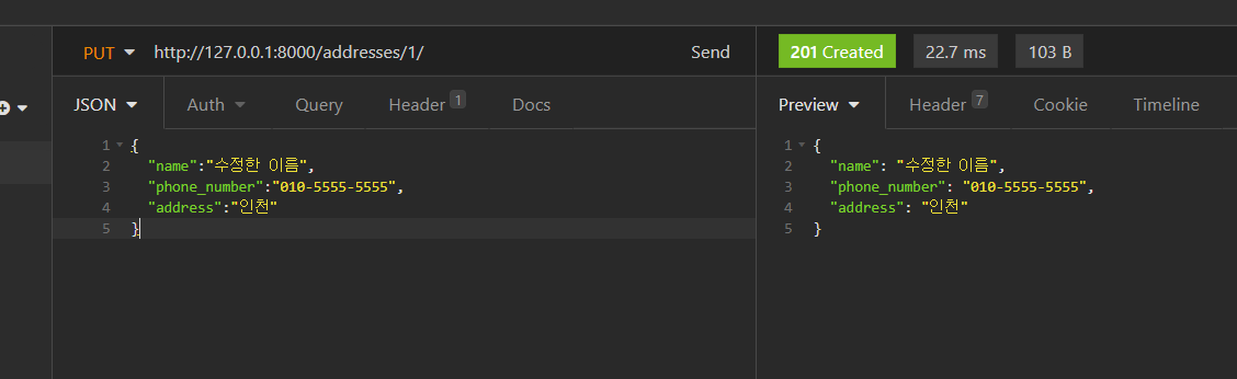 수정(PUT), 삭제(DELETE) 또한 단건 조회와 같은 특징으로 하나의 객체를 선택해서 처리하는 로직이기 때문에 공통적으로 하나의 객체를 받아서 처리하는 address(함수) 에서 기능을 구현 한다. 수정(PUT) 같은 경우 로직은 생성(POST)와 비슷한데 차이점이라고 하면 Serializer에 넣을때 선택된 객체도 같이 넣은 후 save()를 한다는 점이다. 신규 생성이 아니라 수정이기 때문에 대상을 넣어야 하는 것 삭제(DELETE) 같은 경우는 .delete()하면 해당 객체가 지워진다.