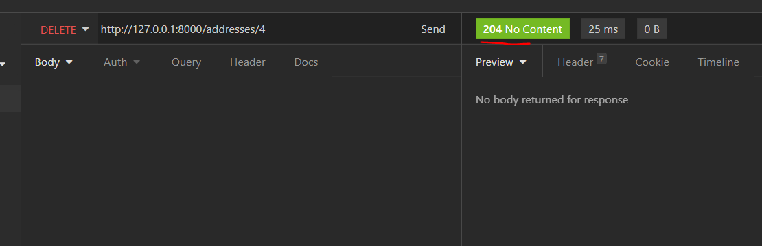 Insomnia를 이용해 요청을 DELTE으로 변경한 뒤 URL 주소 에서 삭제를 원하는 객체의 PK값을 적어서 요청을 보내면 성공 시 204 응답 코드를 받는 걸로 return 값을 설정 했기 때문에 204 요청만 오고 다른 값은 없는 것을 확인할 수 있다.