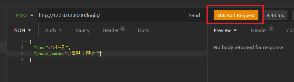 POST 요청으로 아이디(name) 와 비밀번호(phone_number)를 보냈을 시 로그인 실패면 400 에러값을 응답으로 돌려주는 것을 확인할 수 있다.